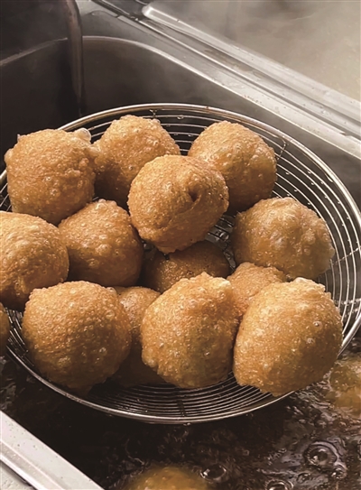 3.将洗好的面筋放入热水中,揪成乒乓球大小的小团,摊平,包入馅料。再放入油锅,炸至金黄捞出。