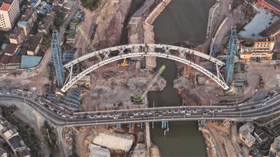 这是2月4日拍摄的建设中的广西平陆运河钦州一桥(无人机照片)。春节假期期间,平陆运河建设工地热火朝天。平陆运河始于南宁横州市西津库区平塘江口,经钦州灵山县陆屋镇沿钦江进入北部湾,全长约134.2公里,建成后将在西南地区开辟一条由西江干流向南入海的江海联运大通道。