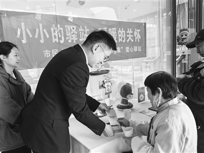 活动当天,支行工作人员早早地在驿站服务点忙碌起来,热气腾腾的茶水和饼干零食等早已整齐摆放,工作人员为环卫阿姨、快递小哥递上一杯杯热水,活动现场温暖满溢。