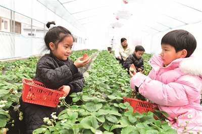 开学首课采草莓 2月13日,全国部分地区的中小学、幼儿园迎来开学第一天,学生们在形式多样的开学第一课中开启新学期。这是杭州建德市杨村桥中心小学学生在校园“农博园”里采摘草莓。