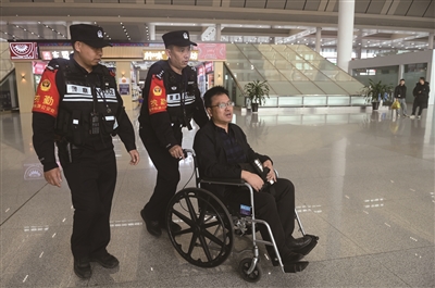 2月14日,在铁路南宁东站,南宁东站派出所民警高明伟(左二)和同事覃超强将一名突发身体不适的旅客送出车站,到医院就医。春运期间,南宁东站一个由车站民警组成的“帮帮队”,为不少旅客解决燃眉之急,暖心守护春运远行人。