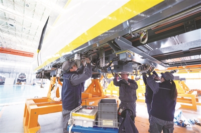 2月14日,在北京市基础设施投资有限公司下属的京投装备河北京车智能制造基地,工作人员在总组装车间内工作。新春伊始,该智能制造基地各生产车间恢复了往日忙碌景象,为北京市地铁线路准备的地铁列车正在有序生产和测试中。据介绍,河北京车为北京地铁13号线生产的44辆新车中,40辆已经完成调试。