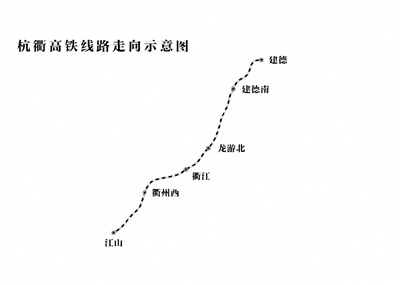 杭衢高铁是浙江省内连通杭州市与衢州市的一条快捷高铁通道,新建正线全长约131公里,设建德、建德南、龙游北、衢江(预留)、衢州西、江山6座车站,设计时速为350公里,桥隧占比达83.7%。杭衢高铁北接杭黄铁路再接湖杭高铁至杭州西站,中连九景衢铁路,南接沪昆高铁。