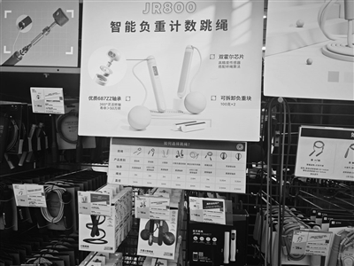 智能负重计数跳绳的产品介绍,醒目地挂在货架中央,吸引顾客驻足