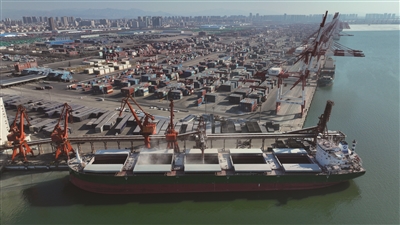 2月18日,在辽港集团营口港鲅鱼圈港区,门机将玉米吊装到散粮运输船舶上(无人机照片)。连日来,营口港码头车船如织,一场大规模的粮食“迁徙”正值高峰。营口港拥有8个粮食装卸泊位和3条铁路运粮专线,粮食中转量长期位居北方港口之首,成为“北粮南运”的主枢纽港。