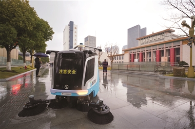 科技“蓝胖” 亮相武林 近日,一个显眼的“蓝胖子”——无人清扫车S330亮相武林广场,开启了环卫新篇章。它拥有一系列“黑科技”,搭载了先进的AI视觉算法,可以通过灵活的走位,把广场上的垃圾“一网打尽”。图为昨天,“蓝胖子”在武林广场进行清扫作业。商报记者 项凯 摄影报道