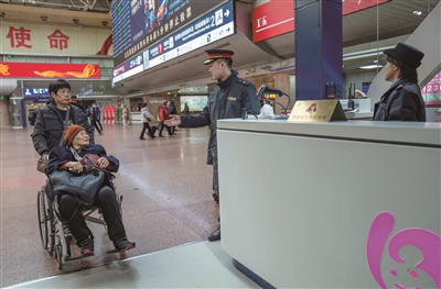 从一个到一群 2月18日,北京西站“036候车室”客运员杨晋宇(右二)在引导行动不便的旅客进入候车室。“036”最初是20世纪70年代北京西直门站客运员李淑珍的胸牌号,她真诚热情为旅客服务,受到广泛好评。1999年,北京西站将服务重点旅客的专用候车室命名为“036候车室”。如今,“036候车室”客运员已达60人。