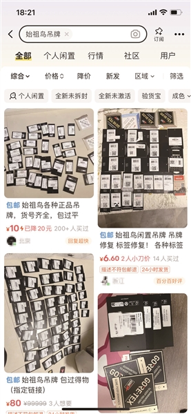 当前,始祖鸟吊牌在二手倒卖市场成为抢手货。记者浏览闲鱼平台时发现,众多店铺专门经营各类始祖鸟吊牌。这些吊牌大致分为两类,一类是产品卡,通常为黑色,正面印有始祖鸟的logo和品牌名称,背面则详细列出衣服的型号、颜色编码、条形码以及产地等信息,且尺寸各异;另一类是专为“世纪面料”GORE-TEX设计的科技卡,包括常见的普通黑标、黑标PRO和白标等。卖家依据吊牌的年份、大小、对应衣服的款式和面料的不同,将价格定在6.6元至280元之间。