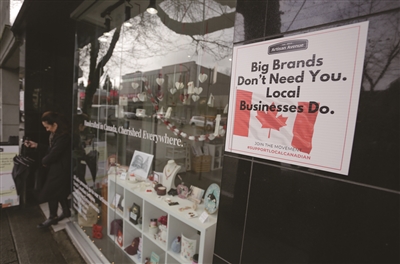 加拿大:加大本土产品推广力度 2月25日,加拿大温哥华一家商店外张贴着宣传本地企业的标牌。 加拿大近日采取措施加大了对于本土产品的推广力度,以应对美国关税威胁。