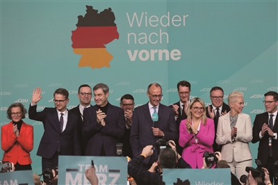 德国联邦选举委员会2月24日凌晨公布德国联邦议院(议会下院)选举初步计票结果。基督教民主联盟与基督教社会联盟组成的联盟党得票领先其他政党,在选举中获胜。选举委员会预测弗里德里希·默茨将被提名为德国新任总理。 这是2月23日,在德国柏林的基督教民主联盟总部,联盟党总理候选人默茨(中)在出口民调显示领先后接受祝贺。