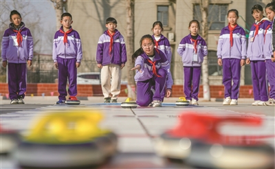 河北省遵化市第三实验小学的学生在大课间掷冰壶。新华社发