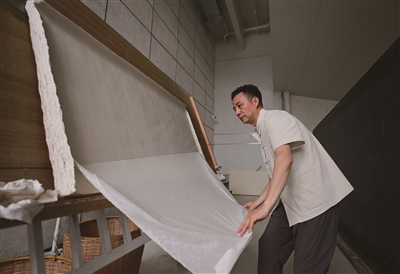 3月6日,在安徽省宣城市泾县中国宣纸小镇宣纸文化园,工人进行晒纸作业和展示。泾县是宣纸的发源地,被誉为“中国宣纸之乡”。近年来,当地推动宣纸产业与全域旅游、文化创意等深度融合,打造集宣纸传统制作技艺展示、文化旅游、休闲观光于一体的综合性文化旅游园区——中国宣纸小镇,成为文旅融合的靓丽新名片。