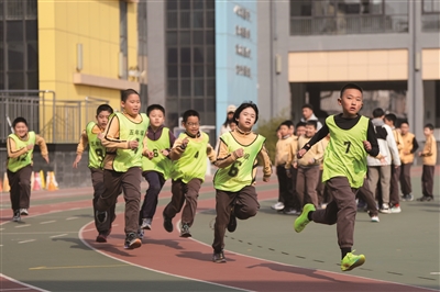 3月5日,北京第二实验小学学生在体育课上进行1000米跑“班级赛”。新学期伊始,北京发布“体育八条”。“体育八条”着重解决学生运动时长不足、体育“阴阳课表”等问题,让校园体育充分促进学生身心健康发展,确保孩子们“眼里有光,身上有汗”。