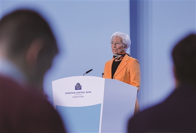 3月6日,欧洲中央银行行长拉加德在德国法兰克福欧洲央行总部举行的新闻发布会上讲话。