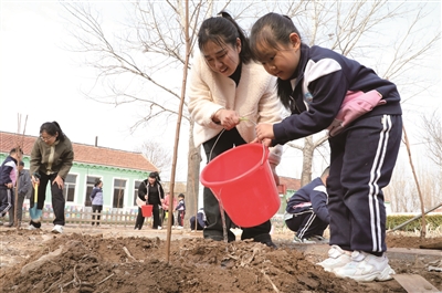3月10日,在山东省滨州市博兴县城东街道中心幼儿园,小朋友和家长一起给刚刚种植的树苗浇水。
