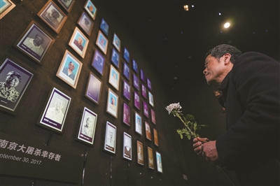 侵华日军南京大屠杀遇难同胞纪念馆 为今年离世的大屠杀幸存者 举行熄灯悼念仪式 3月11日,南京大屠杀幸存者艾义英的儿子黄兴华在熄灯悼念仪式上献花。 当日,侵华日军南京大屠杀遇难同胞纪念馆为今年离世的南京大屠杀幸存者艾义英、伍秀英、易兰英、陶承义举行熄灯悼念仪式。截至目前,南京市侵华日军受害者援助与南京大屠杀历史记忆传承协会登记在册的在世幸存者仅剩28人。