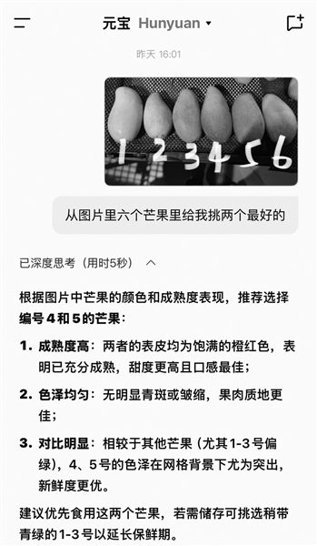 面对货架上颜色、个头都相差甚大的芒果,小语有些无从下手,于是她拍下芒果照片,并在照片中给芒果手写编号,向腾讯元宝提问:请根据芒果的特性帮我挑选图片中品质较好的两个。这一次,腾讯元宝经过5秒的深度思考后给出了答案。