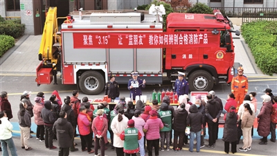3月13日,在江苏省淮安市洪泽区高良涧街道,消防员为市民讲解如何辨别消防产品真假(无人机照片)。新华社发