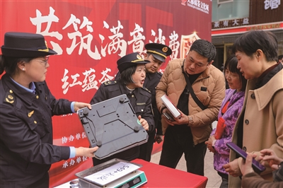 3月14日,在山东省青岛市李沧区天都锦茶文化城举办的国际消费者权益日宣传活动中,工作人员为市民介绍合格计量器具辨别方法。新华社发