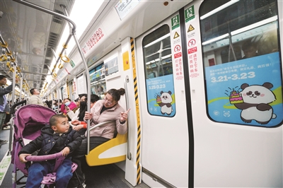 3月21日是杭州动物园的“顶流明星”——大熊猫“春生”的5周岁生日。3月15日起一个月内,杭州地铁10号线的其中一班列车(1、2号车厢)成了“春生”的生日专列,车厢内外贴满它的可爱形象,让乘客感受到浓厚生日氛围。商报记者 项凯 摄影报道