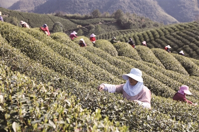 春日采茶忙 在浙江省杭州市余杭区径山镇四岭村茶园,茶农在采摘春茶。 春茶长势正盛,各地茶农抢抓农时、采摘春茶供应市场,春意盎然的茶山一派繁忙景象。