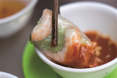 咖啡润了润喉后,准备试试这道米纸卷,里面包裹着满满的馅料,有檬粉、虾肉,还有薄荷叶、九层塔,一口下去,层次感特别丰富。“这是在上桌前我们现包的,里面的馅用的是鲜虾,每天限量的。”