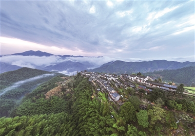 3月27日,一场春雨过后,安徽省黄山市休宁县溪口镇上依山而建的徽派古村落木梨硔村云雾缭绕,错落有致的民居若隐若现,宛如仙境。这是黄山市休宁县溪口镇木梨硔村雨后景致(无人机照片)。