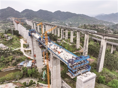 这是3月28日拍摄的渝万高铁蔡家沟双线特大桥建设现场(无人机照片)。目前,渝万高铁蔡家沟双线特大桥建设稳步推进。该特大桥位于重庆市涪陵区境内,桥长2113.3米,最高主墩为150.5米,为渝万高铁全线最高墩。项目建成通车后,将加强渝东北三峡库区城镇群和主城都市区的便捷联系。