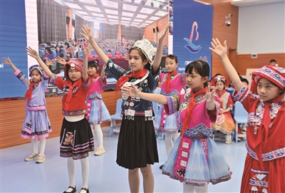 3月28日,广西南宁市滨湖路小学四(1)中队和内蒙古鄂尔多斯东胜区第十二小学四(9)中队举行“壮蒙一家亲,共筑中国梦”手拉手主题云队会。双方队员在辅导员老师的带领下,一起唱歌、相互介绍传统文化、展示传统美食,其乐融融。这是南宁滨湖路小学四(1)中队队员在演唱壮族童谣《梦田》。