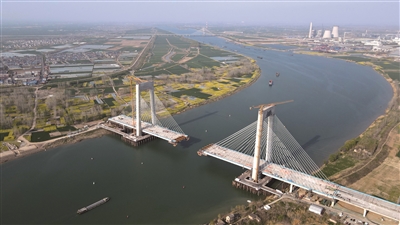 4月2日,位于安徽省滁州市凤阳县的G329临淮关跨淮河特大桥(无人机照片)在加紧建设。目前,位于安徽省蚌埠市、滁州市的3座跨淮河特大桥建设稳步推进,中铁四局施工人员抢抓春季有利天气,奋战在建设一线,高标准高质量推进大桥建设。
