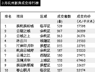 数据显示,在3月杭州新房成交量的前十榜单上,有8个都是限价项目,只有下沙的沐云川和临安的春山明月不限价。具体来看,滨杭滨纷城3月份一共成交了539套房源,是第二名的两倍,处于断层式领先,延续了新年以来的良好销售势头。