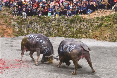 4月6日,贵州省黔东南州锦屏县固本乡举办三月初九牯藏节斗牛民俗活动,来自各苗乡侗寨的人们齐聚斗牛塘,斗牛欢庆牯藏节。这是人们在锦屏县固本乡东庄村观看民间斗牛。