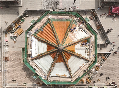 沈阳故宫大政殿等部分建筑 进行维护保养 这是4月6日拍摄的保养维护中的沈阳故宫大政殿。根据沈阳故宫博物院发布的公告,2月25日至5月30日,沈阳故宫对东路的大政殿、正红旗亭、镶红旗亭、井亭屋面进行保养维护。始建于1625年的沈阳故宫,是中国保存完好的两座古代宫殿建筑群之一。