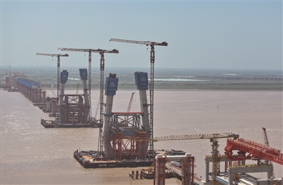 4月13日,崇启公铁长江大桥4号主塔第17节浇筑完成,塔身高度突破100米,大桥进入上塔柱施工阶段。这座大桥是沪渝蓉高速铁路全线重点控制性工程,大桥全长4.09公里,横跨长江北支,是江苏启东与上海崇明的主要连接通道。这是崇启公铁长江大桥4号主塔(中)第17节浇筑施工现场(无人机照片)。