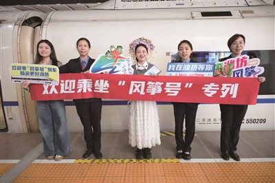 4月16日,首趟从北京始发的“潍坊风筝号”旅游专线列车从北京南站发车,该列车融合风筝文化、非遗展示和旅游推广,打造沉浸式风筝主题列车体验。这是北京南站工作人员在“潍坊风筝号”旅游专线列车前欢迎乘客。