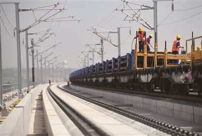 4月18日,随着首对500米长钢轨被平稳地铺设在无砟轨道板上,西延高铁全线铺轨施工正式启动,西延高铁建设进入最后攻坚阶段。西安至延安高速铁路全长299.8公里,是陕北革命老区的首条高铁。线路建成投入运营后,西安至延安的运行时间将从目前的两个半小时缩短至1小时左右。这是工人在西延高铁西安阎良段进行铺轨作业。