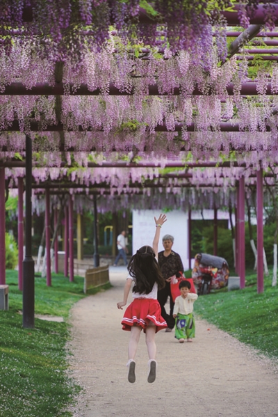 紫藤盛开 浪漫满城 上城区东湖路市民公园正在举办紫藤花展。该花展以“星河垂瀑,浪漫满城”为主题,将持续至4月24日。公园内有一条长约365米的紫藤长廊,种植了12个品种、200余株紫藤,一簇簇紫藤花开正盛,如流苏般轻柔垂下,浪漫唯美,双休日,吸引了不少市民前来拍照打卡。 商报记者 项凯 摄影报道