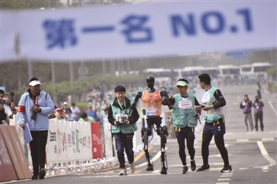 天工队选手天工Ultra(中)在比赛中冲向终点。