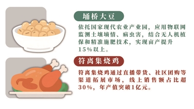 在加快形成新质生产力的时代浪潮中,宿州市埇桥区的农业企业还以创新为笔,以品质为墨,不断为农产品生产注入创新活力。桂晨介绍,埇桥区的埇桥大豆、符离集烧鸡、夹沟香稻米、糯玉米等特色农产品在培育和生产中融入了多项创新性举措,结合现代科技、产业融合和政策支持,形成了具有区域标志性的农业发展模式。“以埇桥大豆为例,我们近年来一直在推广非转基因高蛋白大豆品种(蛋白质含量达42%以上),联合农科院开展抗逆性、高产性育种,适应皖北气候条件。 同时,在数字化种植管理方面,我们本土企业依托国家现代农业产业园,应用物联网监测土壤墒情、病虫害,结合无人机植保和精准施肥技术,实现亩产提升15%以上。”桂晨表示。