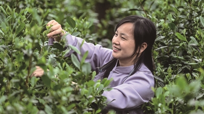 4月24日,广西三江侗族县茶商曹丽琼在当地光辉村茶园采茶。2010年,曹丽琼辞掉广州的工作返乡创业,带动当地十几个村寨1000多户茶农实现增收。她说:“小小茶叶能帮助乡亲们增收,我很开心。”