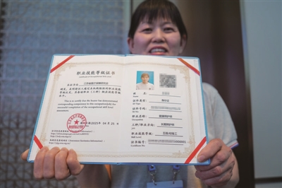 4月28日,长期照护师代表展示自己的“000001”编号证书。