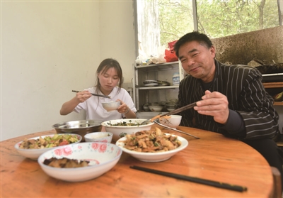 4月14日,25岁的苗族姑娘、广西融水县杆洞乡高培村小学校长梁巧和父亲梁忠林在学校吃午饭。梁巧大学毕业后回到母校,和父亲一起站到三尺讲台上教书育人。2022年9月,梁巧被任命为学校校长。除行政工作以外,梁巧还承担英语、语文、舞蹈、美术的课程。