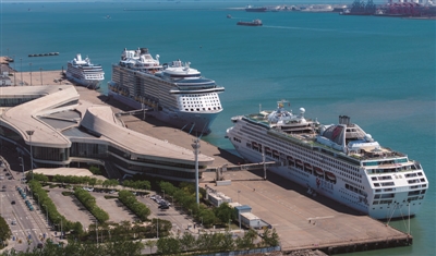 5月1日,天津国际邮轮母港迎来皇家加勒比邮轮“海洋赞礼”号、东方邮轮“梦想”号和大洋邮轮“芮吉塔”号三艘国际邮轮同时停靠,这也是天津国际邮轮母港复航以来的首次“三船同靠”。这是三艘国际邮轮停靠在天津国际邮轮母港(无人机照片)。