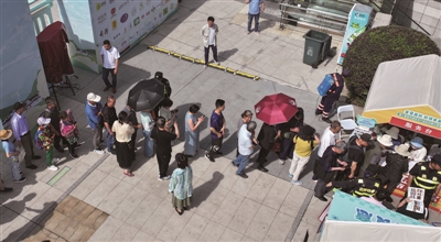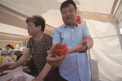“我去年在农展买过一次砀山梨后,便爱上了这个脆嫩多汁的口感,今天是冲着砀山梨来的!”钱女士走到了安徽砀郡梨业集团有限公司所在的展位前,砀山梨、现榨梨汁、梨膏、小吊梨汤……砀山梨及其衍生品整齐陈列在此。“天热,我们的鲜榨梨汁特别畅销,一杯大概需要3个6两左右的梨!”展位旁三位工作人员分工合作削皮、切块、榨汁……一系列操作行云流水,顾客络绎不绝。截至昨日下午4点,该展位售出150多杯梨汁。工作人员表示,经过的顾客都会买几个梨或买上一杯清凉的梨汁,切块的手指都麻了。