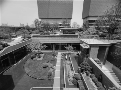 由于做了架空平台,所以从小区大门进来后,要通过售楼处所在的会所二楼的空中连廊才能到达架空层,也可以在地面搭乘扶梯上到位于架空平台上的中心园林。