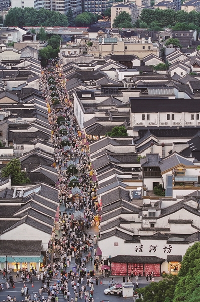 昨天是五一假期第二日,杭城迎来首个客流高峰,经典景区与新兴业态齐发力,传统韵味与现代活力交织,绘就“人景相融、购销两旺”的假日图景。当日,全市共接待游客343.22万人次,同比2024年增长32.52%。图为昨天,游客在杭州清河坊街区内消费打卡,享受美好假日。商报记者 项凯 摄影报道