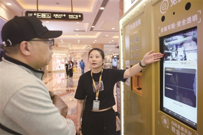 “智慧金店”亮相上海 5月5日,在上海市普陀区一家商场内的“智慧金店”,工作人员向用户介绍黄金回收过程。近日,“智慧金店”亮相上海商场。“智慧金店”包含“智能黄金回收”和“自助黄金购买”功能,“智能黄金回收”系统具备自助下单、自动检测、快速回款等功能,系统可自动检测用户放入的黄金重量和纯度,根据实时金价计算回收金额并迅速打款,成为黄金回收领域的一项新探索。