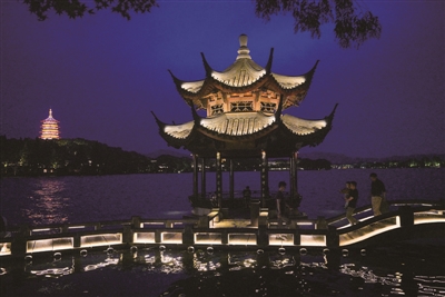 经过两个月的封闭维护施工,位于西湖景区长桥公园的夕影亭近日焕新归来。夕影亭建于2002年,是一座八柱重檐攒尖顶的木结构(榫卯连接)亭子。此前,因建筑基础承台深入湖中,长期受湖水扰动影响,发现有轻微倾斜现象。今年2月26日起,西湖景区凤凰山管理处对其开展了“纠偏维护工程”。图为昨晚,游客在重新回归后的夕影亭旁休憩拍照。 商报记者 项凯 摄影报道