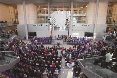 德国新一届联邦政府成员宣誓就职 这是5月6日在德国柏林的国会大厦拍摄的德国新一届联邦政府成员宣誓就职现场。当日,德国新一届联邦政府成员在联邦议院全体会议上宣誓就职。