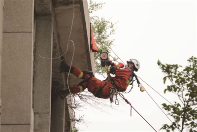 5月7日至9日,山东省地震灾害救援跨区域实战拉动演练在东营市举行。此次演练共有16支来自全省各地的地震救援专业队伍和中国救援山东搜救犬机动专业支队参加,演练内容包括废墟搜救、狭小空间破拆救援、高空救援等。这是地震救援队员(蓝朋友)在利用绳索系统进行演练。